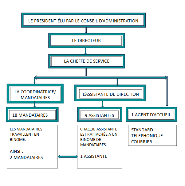 Sous l’autorité du Conseil d’Administration, notre service est composé d’une équipe de direction, 18 mandataires judiciaires, 9 assistantes de mandataires et un agent d’accueil.